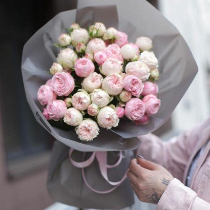 Авторский букет из голубой Гортензии, пионовидных Роз и Хризантемы Момоко