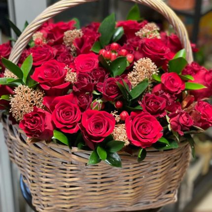 Букет из гортензии, гвоздик, гиперикума, эустомы, роз, эвкалипта и фисташки в плетеной корзине “Ариадна”