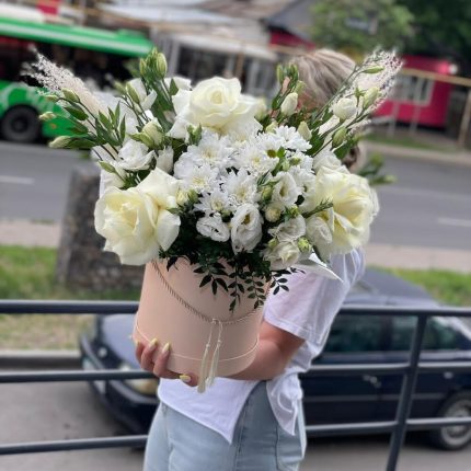 Коробка Робкий поцелуй из роз сорта квинси, охара, эустомы, генисты и диантуса