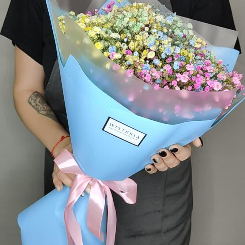 Лента атласная – 1 шт.Упаковка дизайнерская – 1 шт.гипсофила радужная – 5 шт.