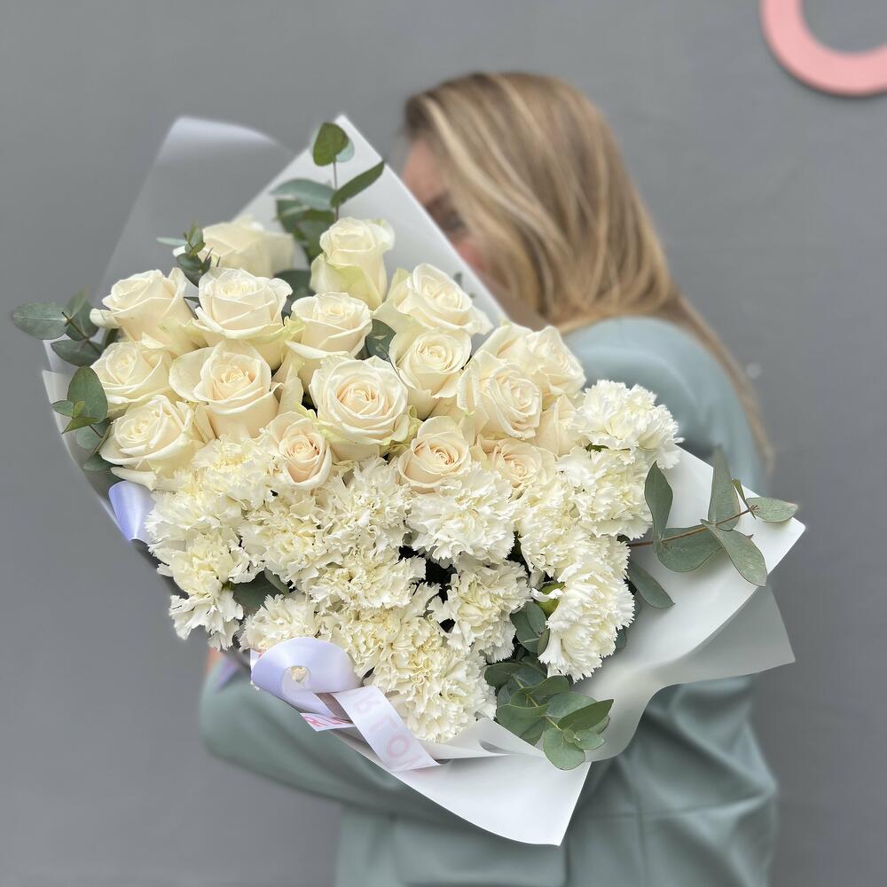 розы – 15 шт.гвоздики – 17 шт.Эвкалипт – 1 шт.Кризал – 1 шт.Аквапак – 1 шт.транспортировочный бокс – 1 шт.