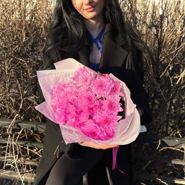 Лента атласная – 1 шт.Открыточка с вашими пожеланиями – 1 шт.Хризантема кустовая крашенная розовая – 5 шт.Тишью белое – 2 шт.пленка матовая белая – 2 шт.