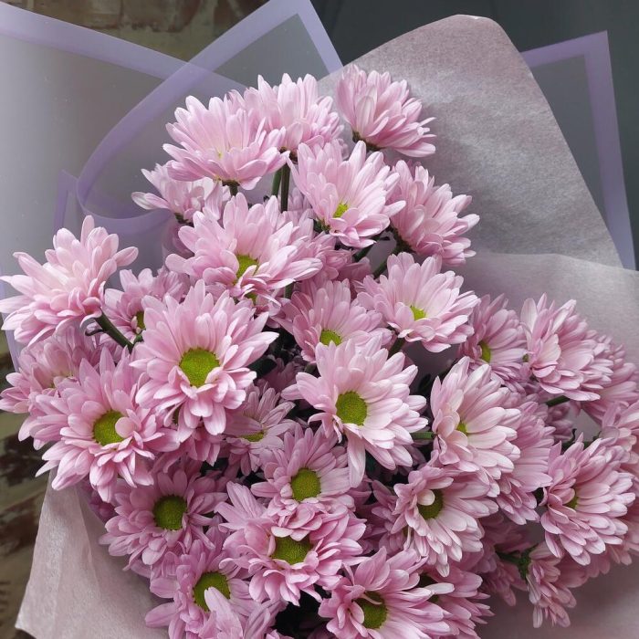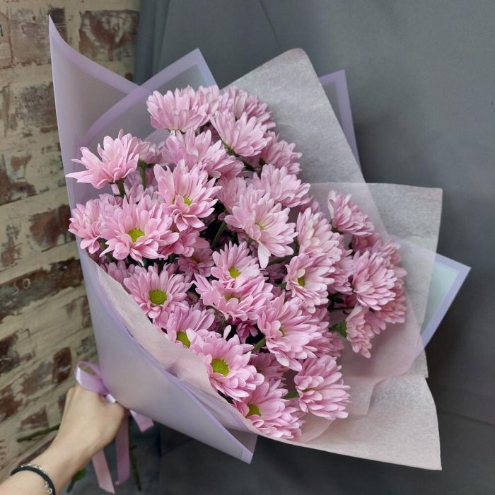 Хризантема – 5 шт.Упаковка дизайнерская – 1 шт.Лента атласная – 1 шт.