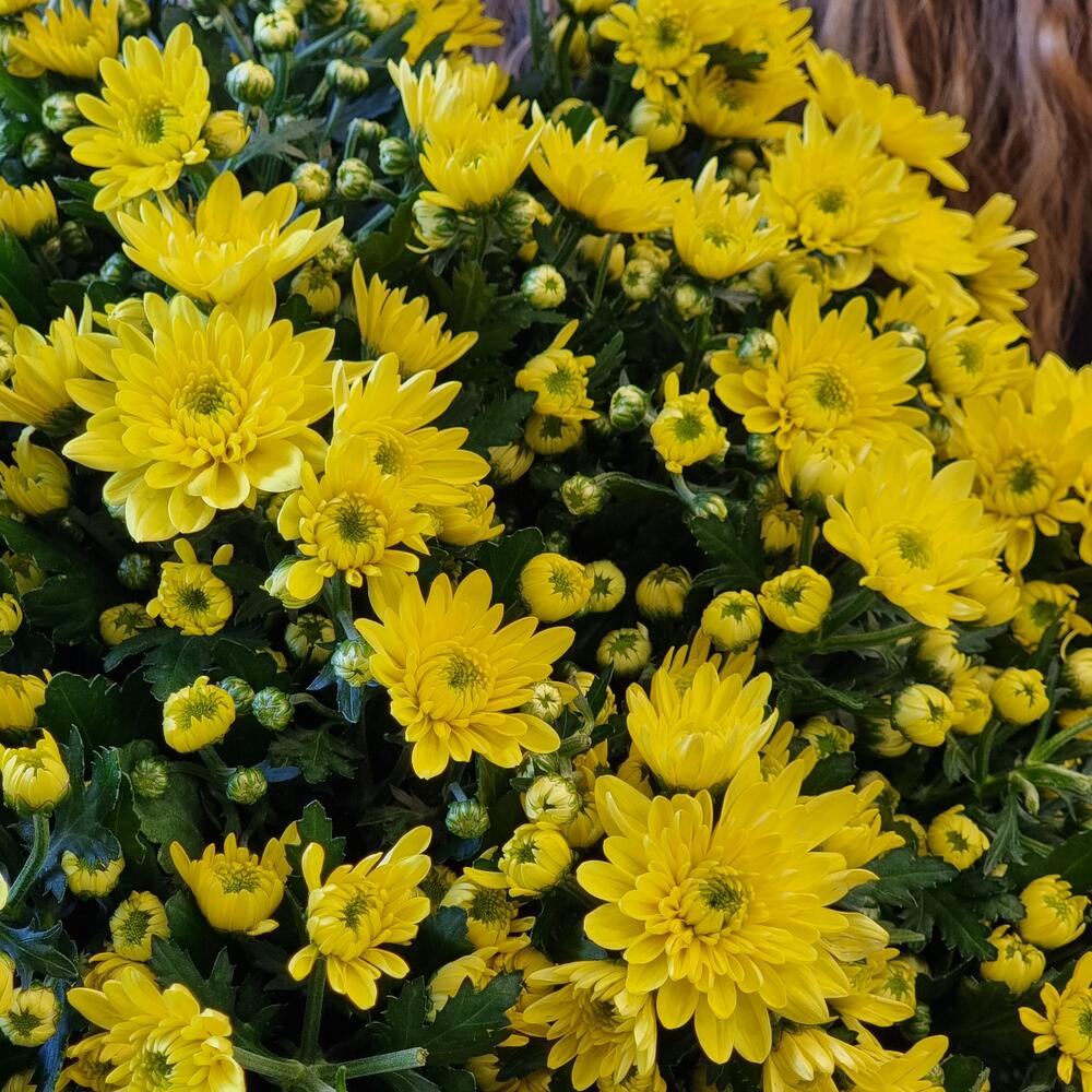Желтая кустовая хризантема – 19 шт.Лента атласная – 1 шт.