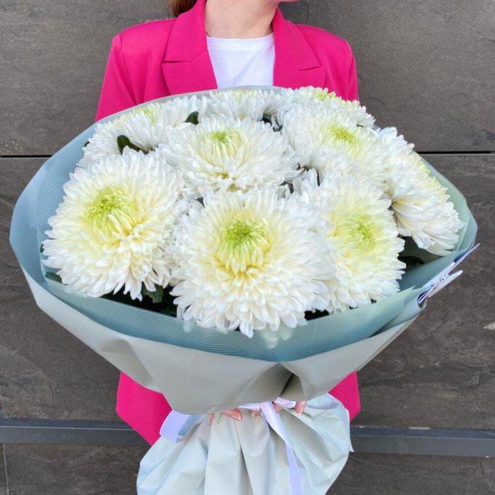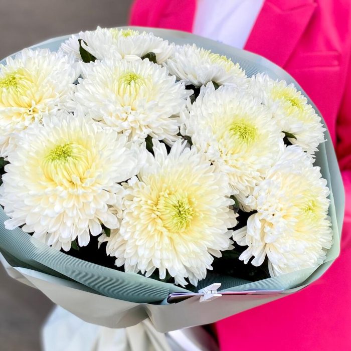 Лента атласная – 1 шт.Упаковка дизайнерская – 2 шт.хризантема штучная – 9 шт.
