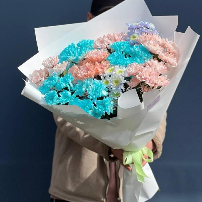 Шикарный яркий букет из радужной хризантемы станет отличным подарком для ваших родных и близких и долго будет радовать своими красками