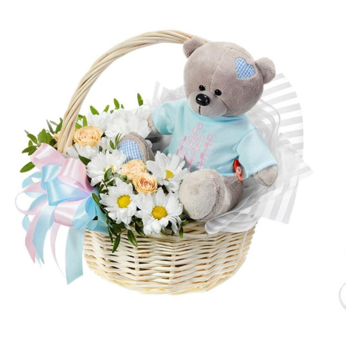 Фисташка – 1 шт.oasis классик кирпич – 1 шт.хризантема кустовая (белый) – 2 шт.пленка цветная – 1 шт.лента атласная (синий) – 1 шт.мягкая игрушка (мини). высота 15 см – 1 шт.корзина плетеная (мал) – 1 шт.