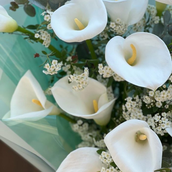 Калла – 11 шт. Лента – 1 шт. Берграсс – 1 шт. Хамелациум – 5 шт. Упаковка дизайнерская – 8 шт.