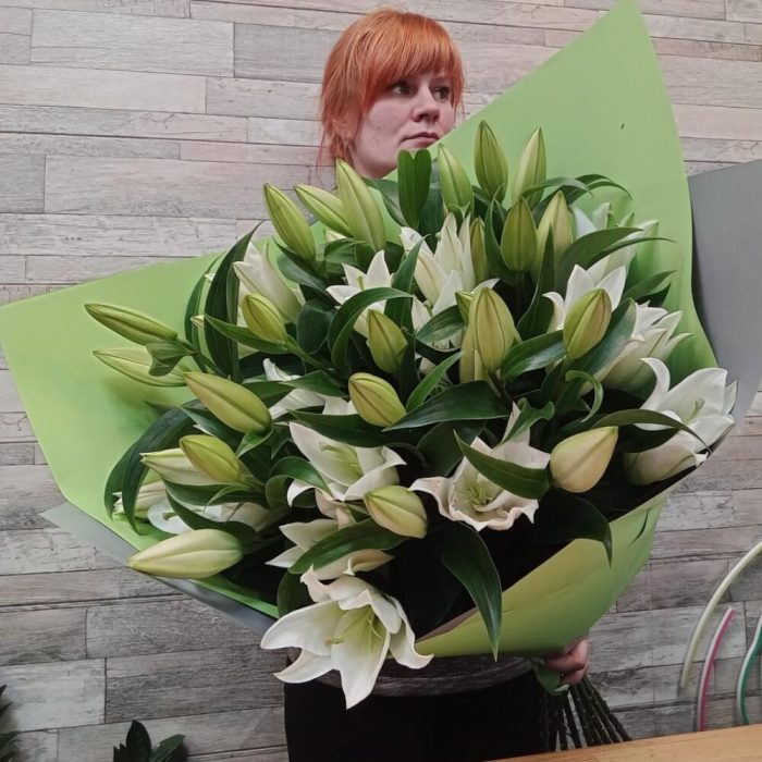 Лента атласная – 3 шт.Упаковка дизайнерская – 4 шт.Лилия ориентальная – 9 шт.
