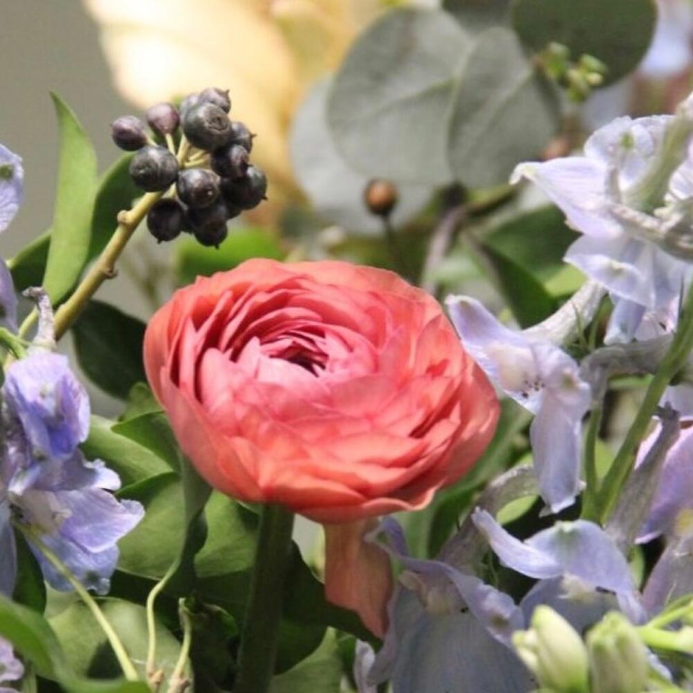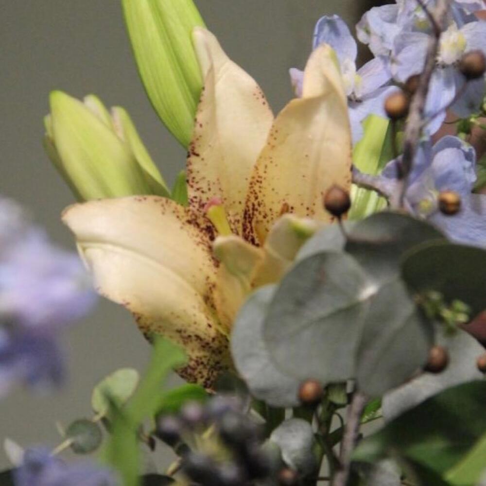 Лилия – 3 шт.Ранункулюс (лютик) – 5 шт.Львиный зев – 5 шт.Дельфиниум – 5 шт.Хедера – 3 шт.лен ветки – 2 шт.Эвкалипт – 7 шт.Лента – 1 шт.