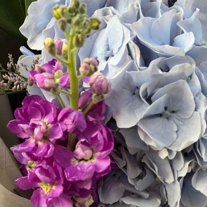 Гортензия – 1 шт.Маттиола – 3 шт.эустома кустовая – 3 шт.Лимониум – 2 шт.эвкалипт кустовой – 3 шт.Упаковка дизайнерская – 1 шт.Лента атласная – 1 шт.