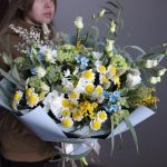 сантини ромашка – 4 шт.Гениста – 1 шт.Твидия – 3 шт.Вибурнум – 2 шт.канареечник – 5 шт.Эвкалипт – 4 шт.Нарцисс кустовой – 3 шт.Лизиантус – 3 шт.Фисташка – 2 шт.Матрикария Ромашка – 2 шт.Упаковка дизайнерская – 1 шт.Мимоза – 1 шт.