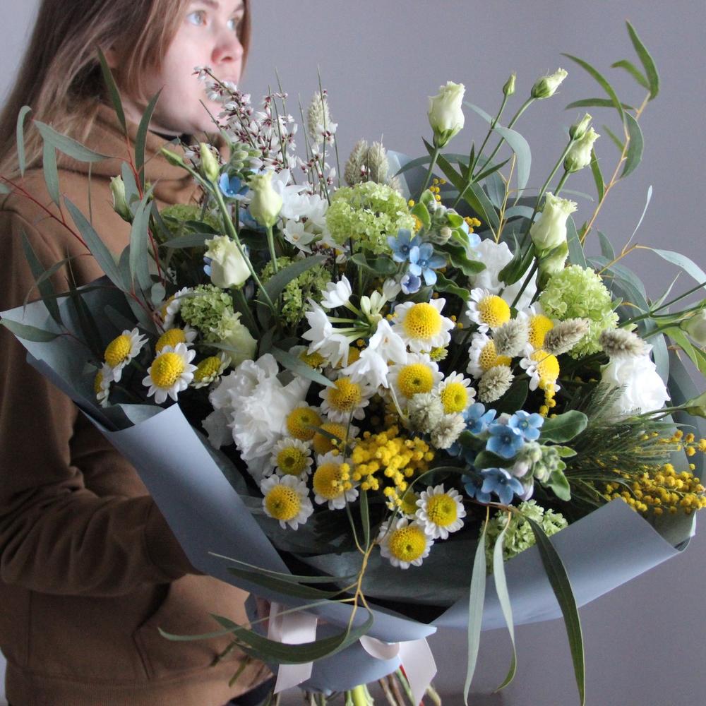 Душистый, весенний букет с мимозой, твидией, генистой, сантини, вибурнумом, канареечником и эвкалиптом.
