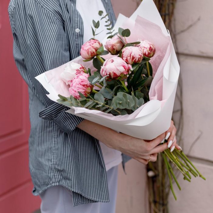 Ароматный букет в нежнейшем и одном из самых крутых сочетаний: пионы и эвкалипт.Не забудьте подрезать цветы перед тем как ставить в воду. Не храните букет на прямых солнечных лучах и возле отопительных приборов, чтобы сохранить цветы как можно дольше.К букету можно добавить открытку, воздушные шары, плюшевую игрушку. Что бы вам подарок остался не забываем .