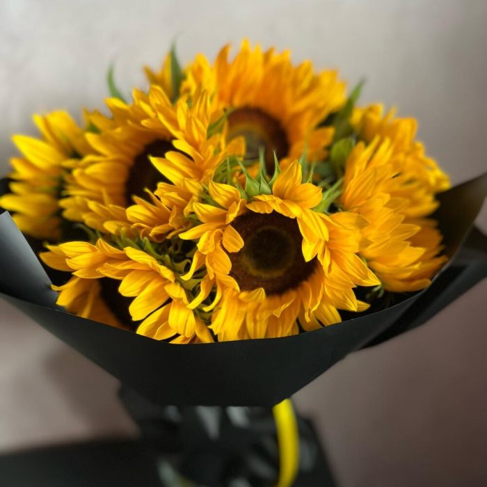 Атласная лента – 1 шт.Подсолнух желтый – 9 шт.декоративная упаковка – 1 шт.