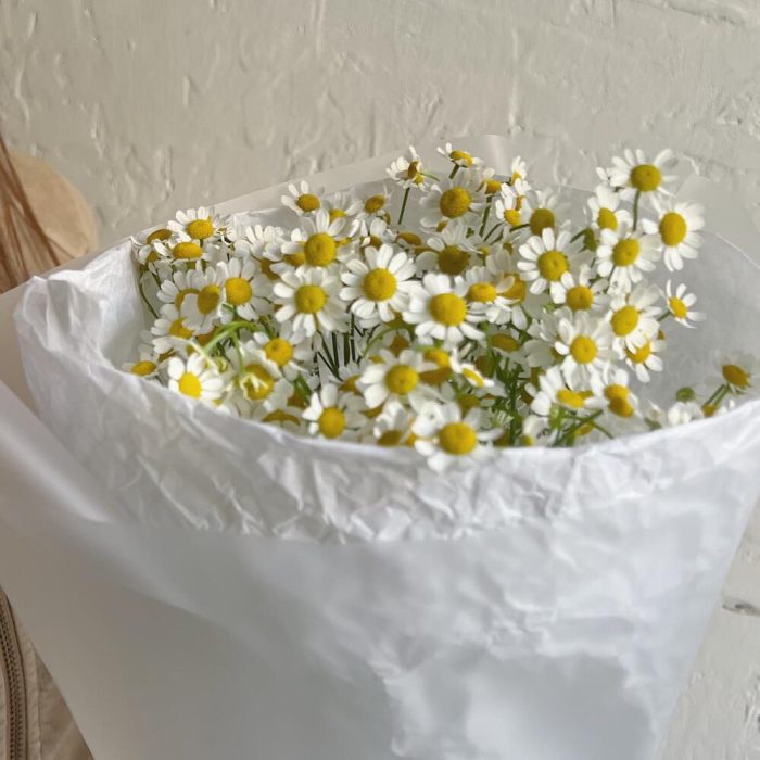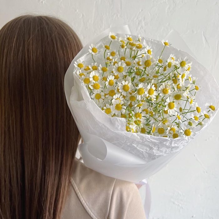 Лента атласная – 1 шт.Ромашка кустовая – 7 шт.Упаковка дизайнерская – 1 шт.Упаковка тишью – 1 шт.