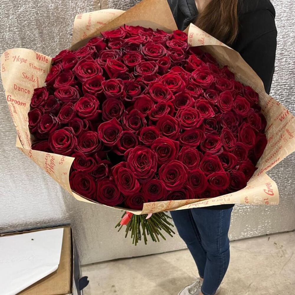 розы эквадор (60 см) – 101 шт.Крафт упаковка – 2 шт.Лента атласная – 1 шт.