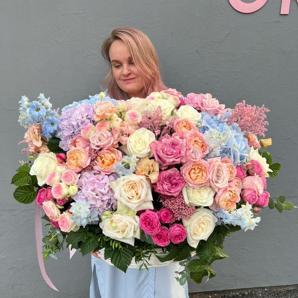 Большая корзина с гортензией, пион. розочками