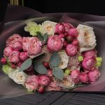 Озотамнус – 2 шт.Лента атласная – 2 шт.Пленка матовая – 5 шт.эустома махровая – 1 шт.Эвкалипт Baby Blue – 2 шт.роза вайт о хара( ароматная) – 5 шт.сильва пинк кустовая роза пионовидная – 5 шт.