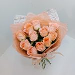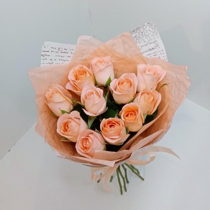 Букет из 11 персиковых пионовидных роз Flash Back 40 см с фисташкой в кремовой пленке