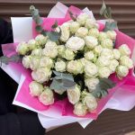 Роза кустовая пионовидная бомбастик – 15 шт.Эвкалипт – 7 шт.Тишью – 2 шт.Пленка матовая – 2 шт.Лента атласная – 2 шт.