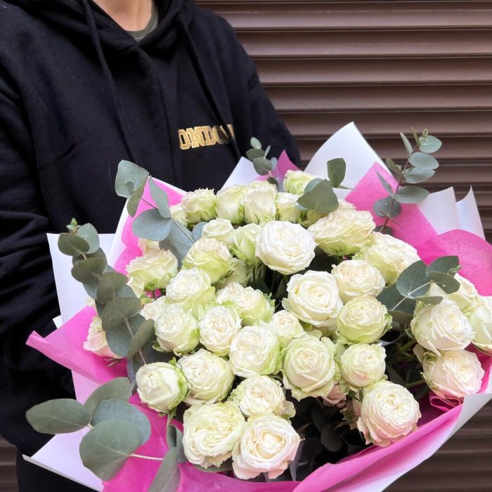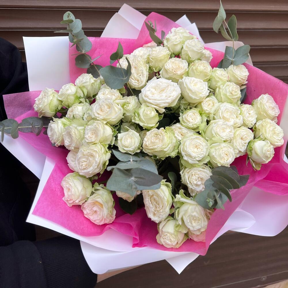 Букет из 15 белых пион роз кустовых с эвкалиптом