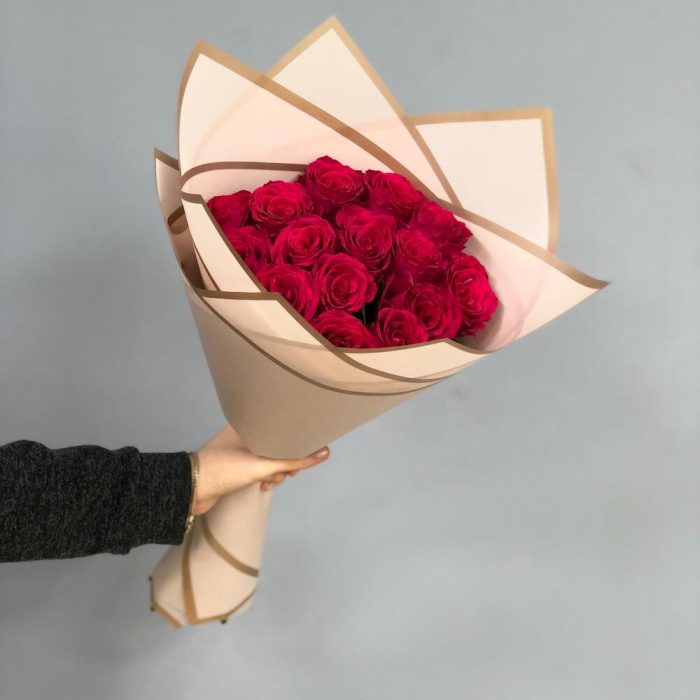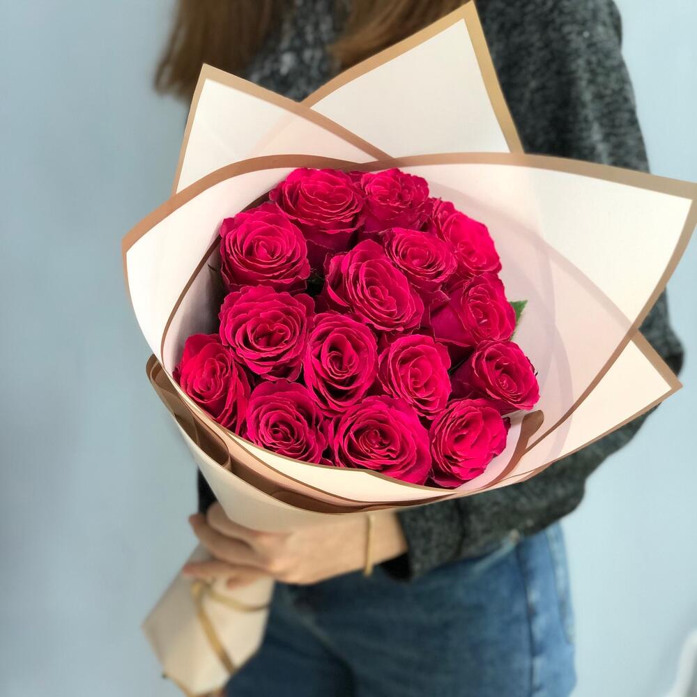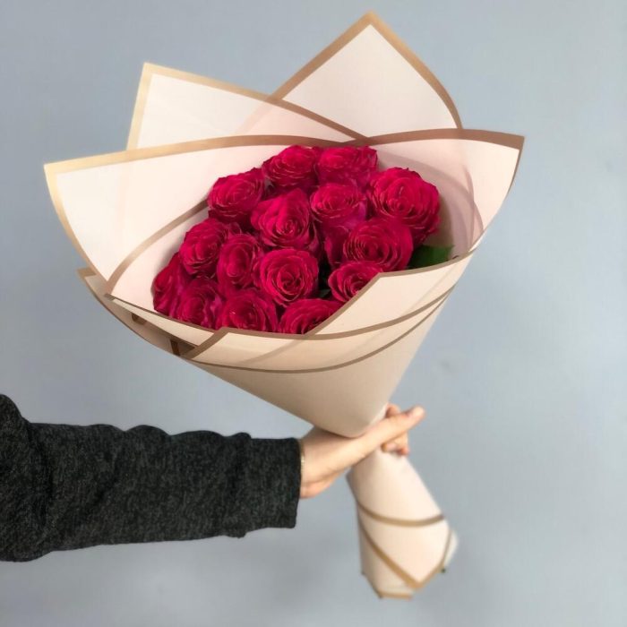 Букет из 15 малиновых роз с оформлением