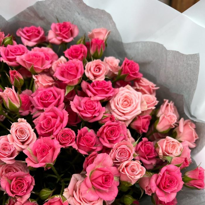 Роза кустовая 60 см – 25 шт.Дизайнерская упаковка – 3 шт.Тишью – 1 шт.Лента атласная – 2 шт.