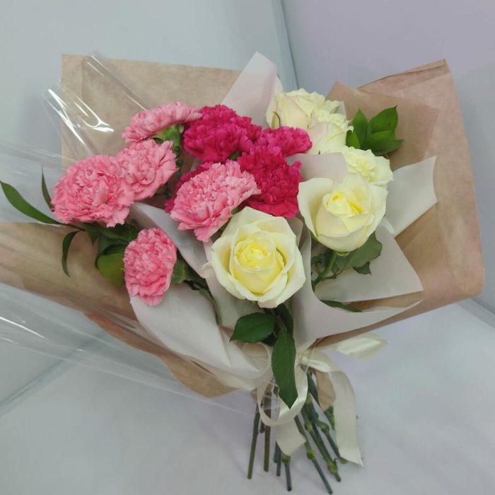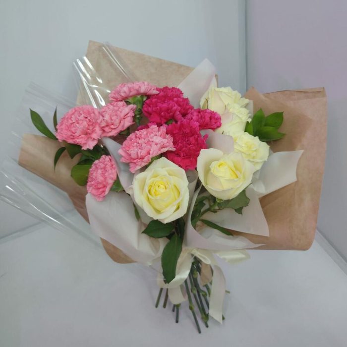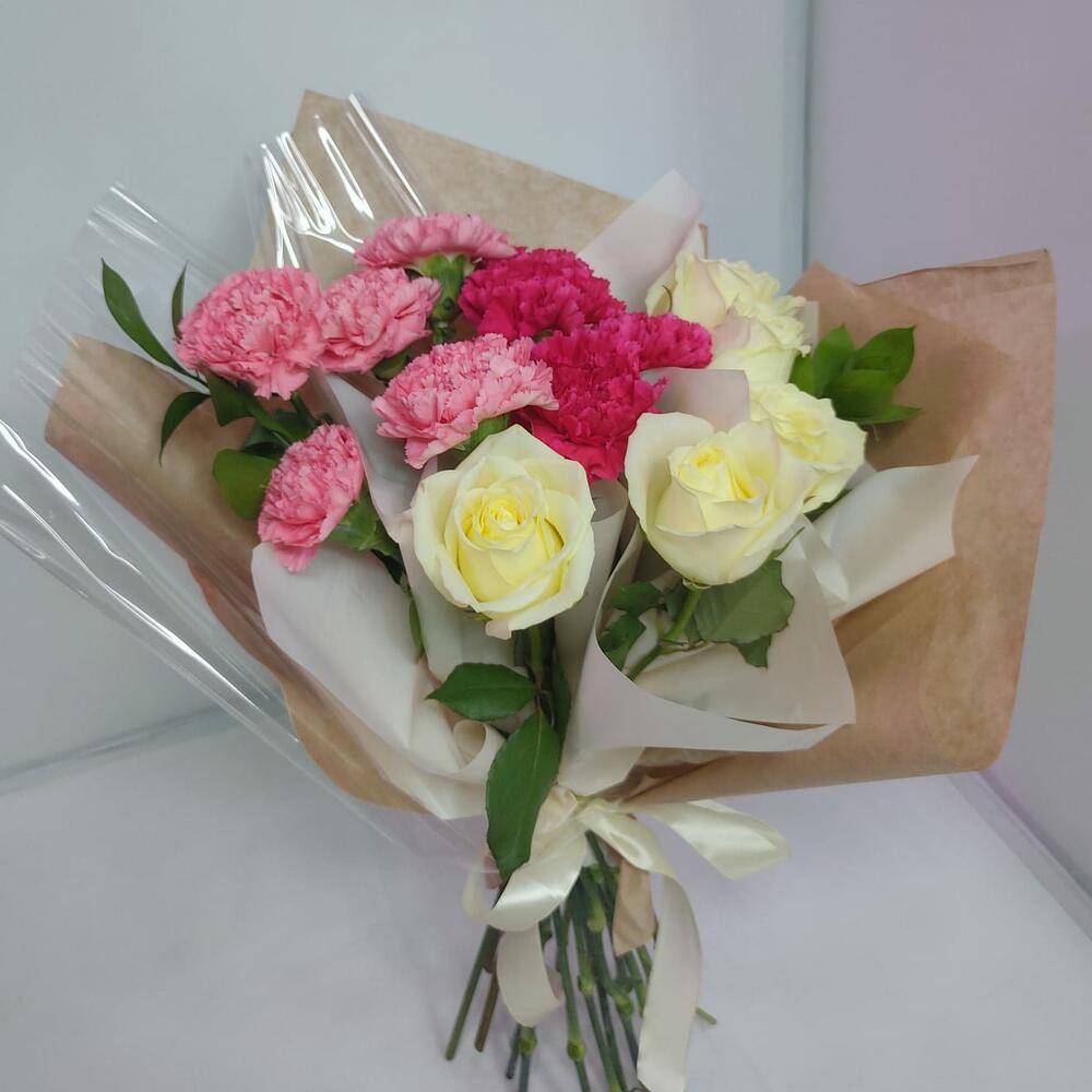 роза кения 40 см – 5 шт.диантусы микс – 10 шт.Рускус – 2 шт.Дизайнерская упаковка – 1 шт.