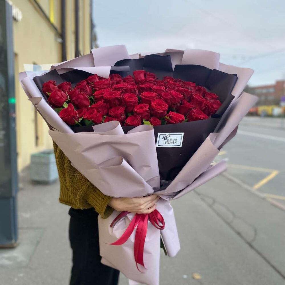 Букет из 59 красных роз в стильной упаковке “Брегенц”