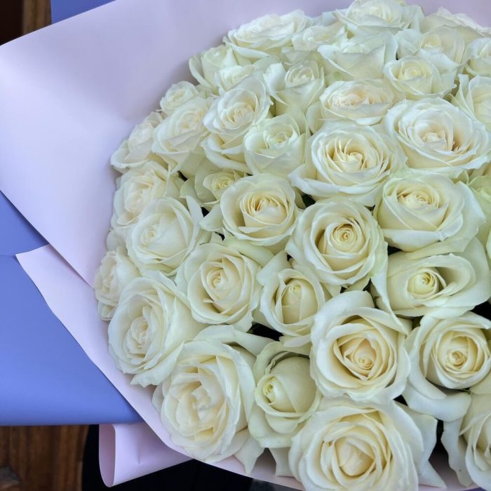 Роза белая 60 см – 65 шт.Дизайнерская упаковка – 5 шт.Тишью – 1 шт.Лента атласная – 2 шт.