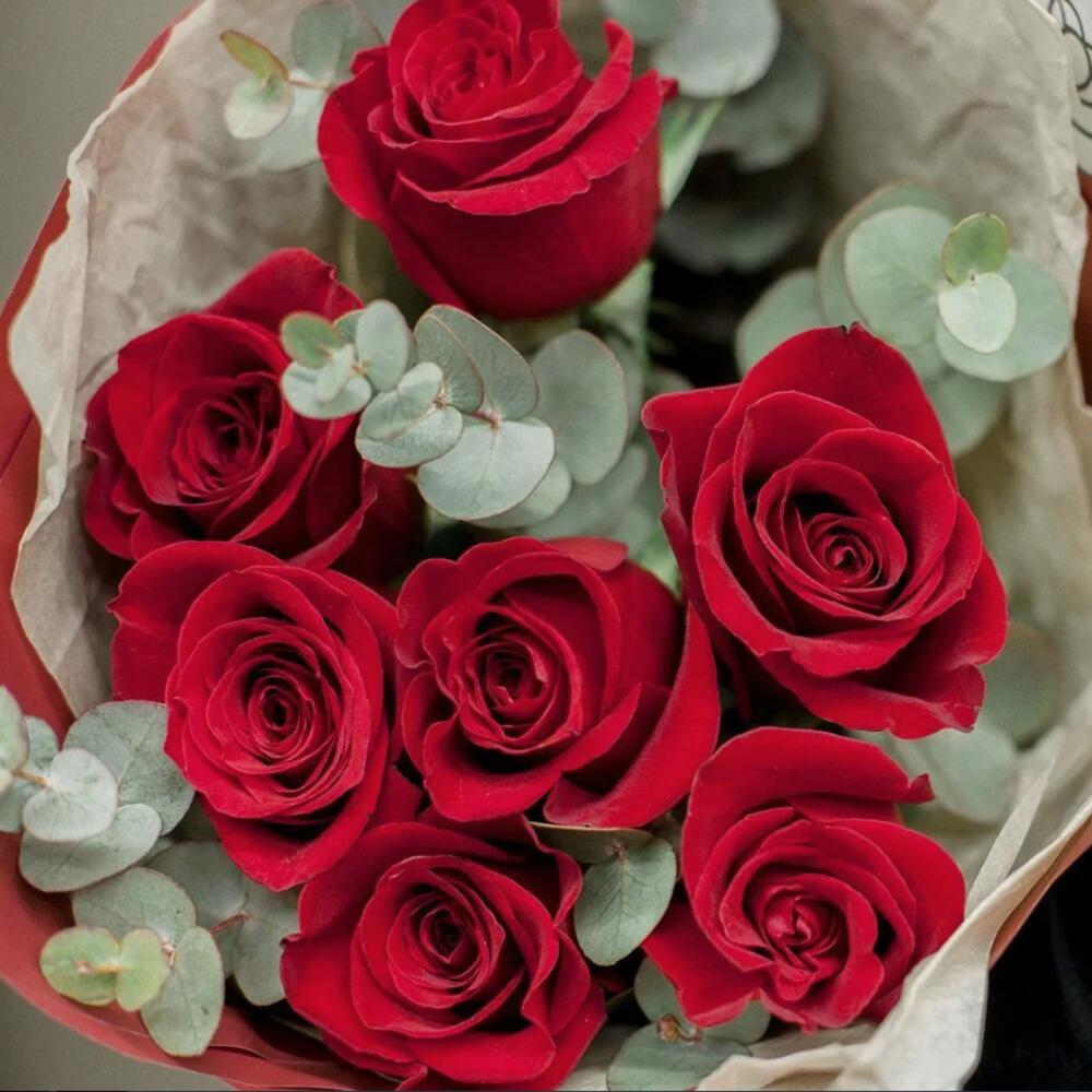Эвкалипт – 2 шт.красные розы (эквадор) 50 см – 7 шт.