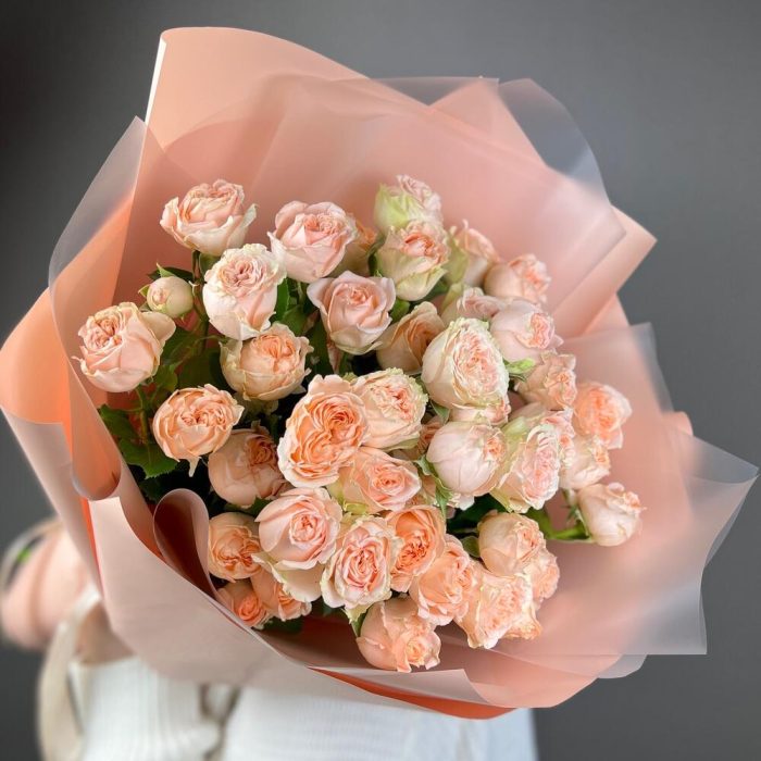Лента атласная – 2 шт.Роза кустовая пионовидная – 9 шт.Пленка матовая – 5 шт.пленка полупрозрачная матовая – 4 шт.