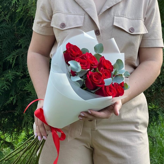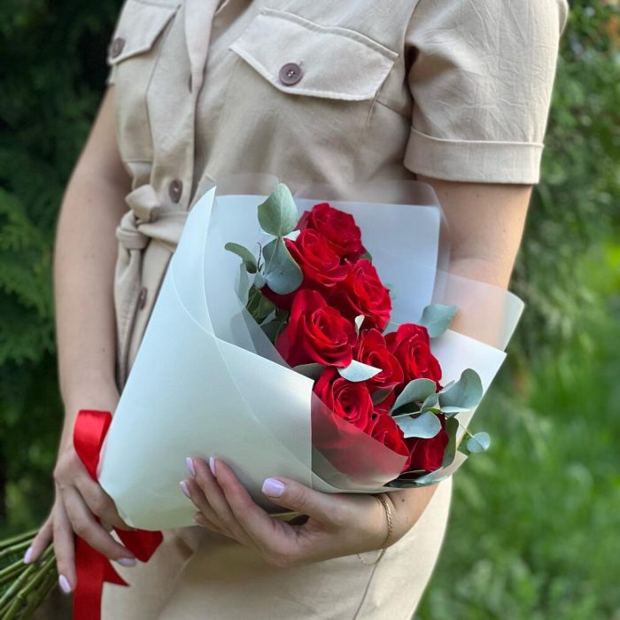 Роза фридом 50 см – 9 шт.эвкклипт – 3 шт.Тишью – 1 шт.Дизайнерская упаковка – 1 шт.