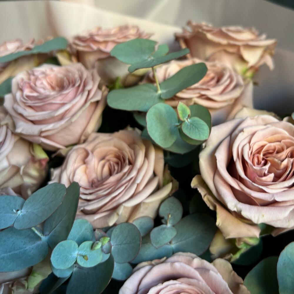 Эвкалипт – 4 шт.Роза одноголовая – 15 шт.Лента атласная – 1 шт.Упаковка дизайнерская – 2 шт.