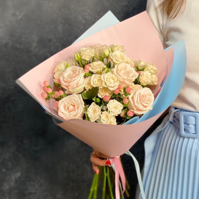 Лента атласная – 2 шт.Упаковка дизайнерская – 1 шт.Гиперикум розовый – 4 шт.Роза Талея 50 см – 7 шт.роза кустовая кремовая грация – 6 шт.