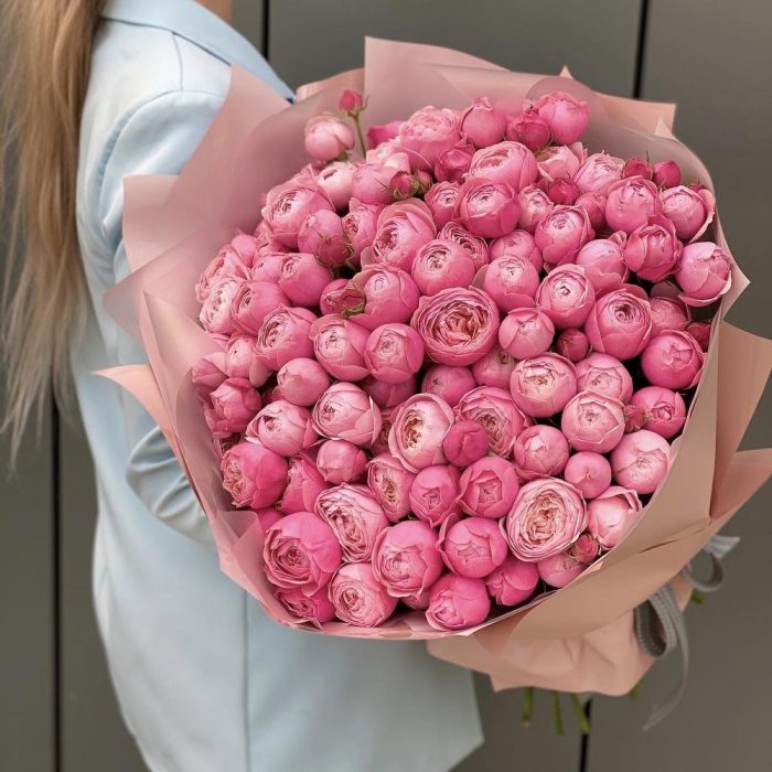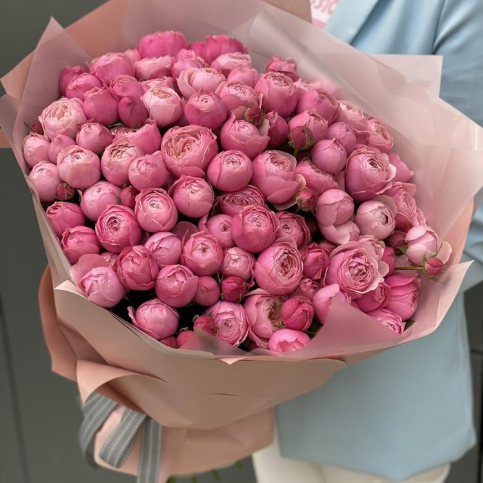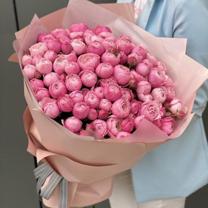 кустовая пионовидная роза сильвия пинк – 35 шт. Писташ – 7 шт. Оформление – 1 шт.