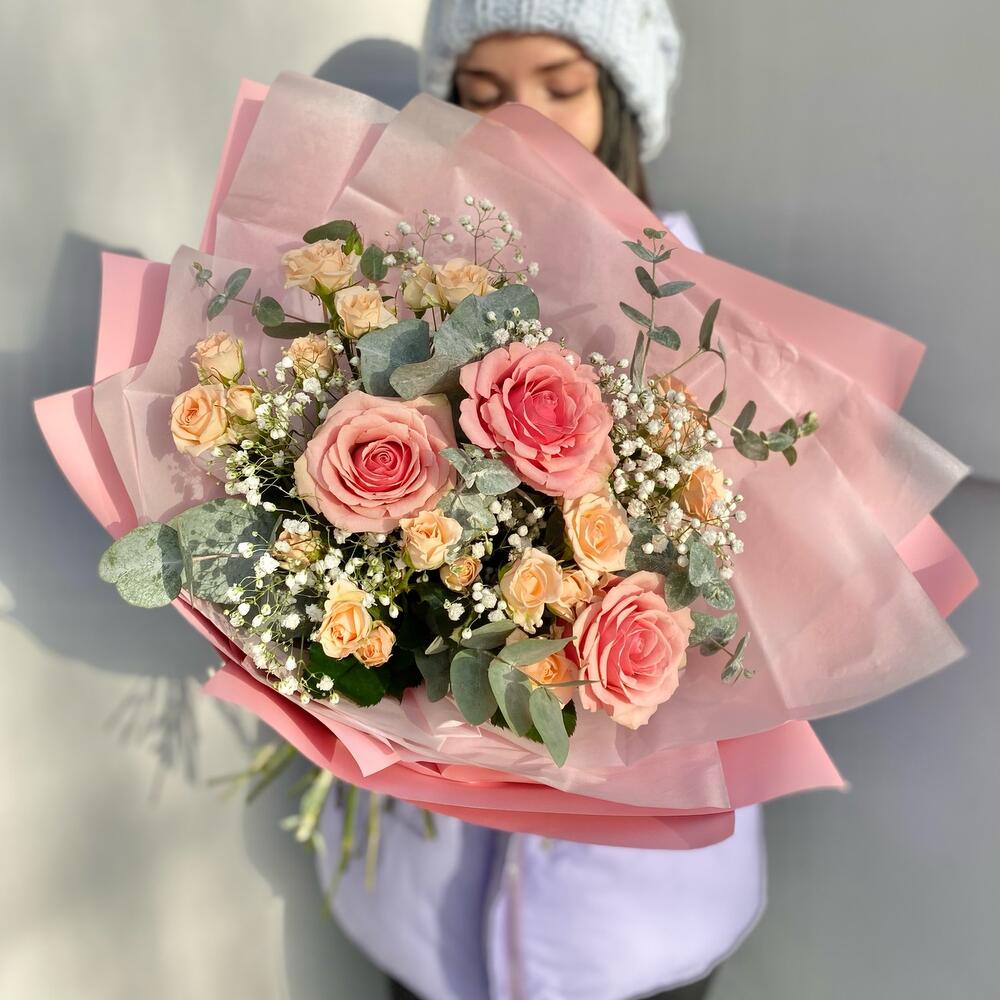 Гипсофила – 3 шт.Роза кустовая – 5 шт.Эвкалипт – 3 шт.Лента атласная – 2 шт.Тишью – 2 шт.Роза пионовидная – 3 шт.Упаковка дизайнерская – 3 шт.