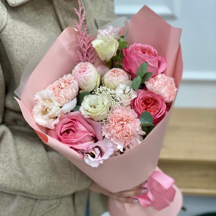 Озотамнус – 1 шт.Гвоздика сортовая – 3 шт.эустома розовая – 1 шт.Конифер – 1 шт.роза пионовидная пинк экспрешн – 3 шт.менсфилд парк кустовая пионовидная – 1 шт.эвкалипт 50 – 4 шт.
