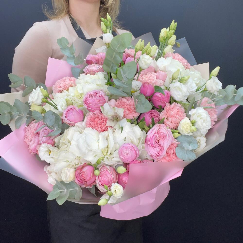Гортензия – 3 шт.Лизиантус – 5 шт.Эвкалипт – 2 шт.Диантус – 13 шт.Роза пионовидная кустовая – 6 шт.Фисташка – 5 шт.Упаковка дизайнерская – 5 шт.