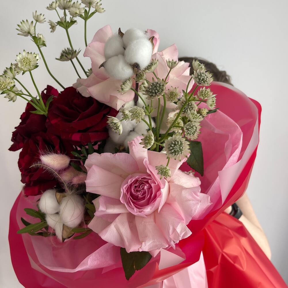 Хлопок – 4 шт.Лента атласная – 2 шт.Фисташка – 1 шт.Французская роза – 2 шт.Пленка матовая – 6 шт.астронция – 2 шт.