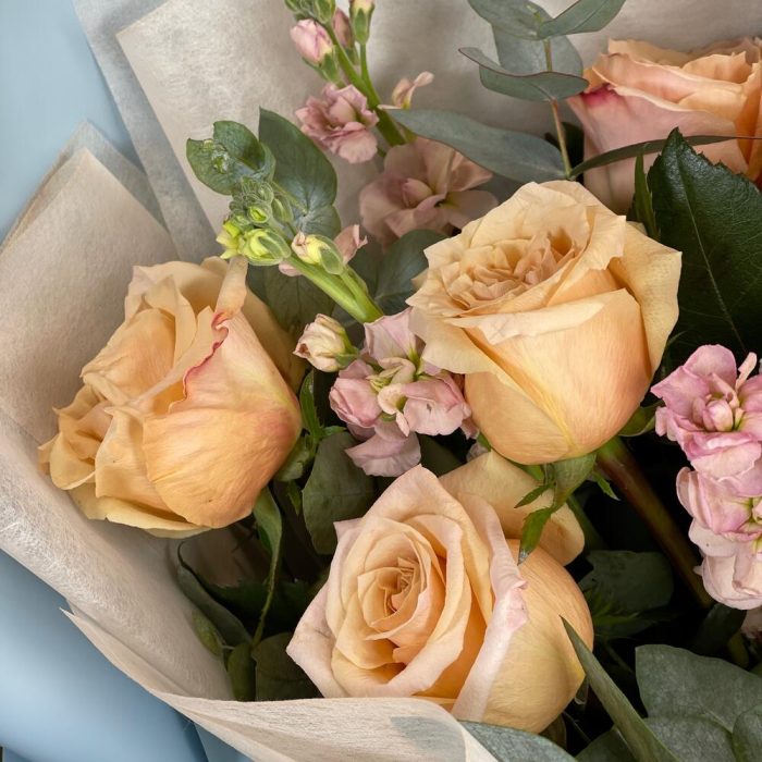 Лента – 1 шт.Маттиола – 5 шт.Эвкалипт – 2 шт.Упаковка – 1 шт.Роза шиммер – 7 шт.