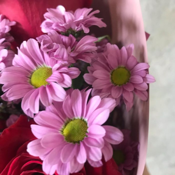 Хризантема кустовая – 3 шт.Роза – 3 шт.Гвоздика кустовая – 2 шт.бумага дизайнерская – 1 шт.