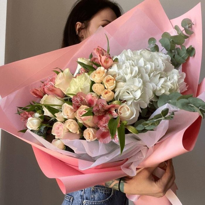 “Эвкалиптическая роскошь” гортензия и пионовидная кустовая роза