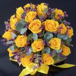 Классическая композиция в шляпной коробке из 21 яркой жёлтой розы, эвкалипта и стабилизированного лимониума
