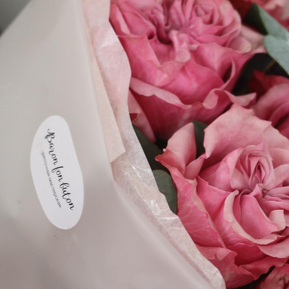 роза кантри блю – 9 шт.Эвкалипт – 2 шт.Тишью – 2 шт.Упаковка дизайнерская – 1 шт.Лента атласная – 1 шт.