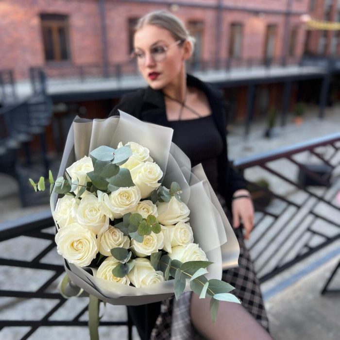 Эвкалипт – 2 шт.Лента атласная – 1 шт.Роза белая – 15 шт.Пленка матовая – 1 шт.Пленка дизайнерская – 1 шт.