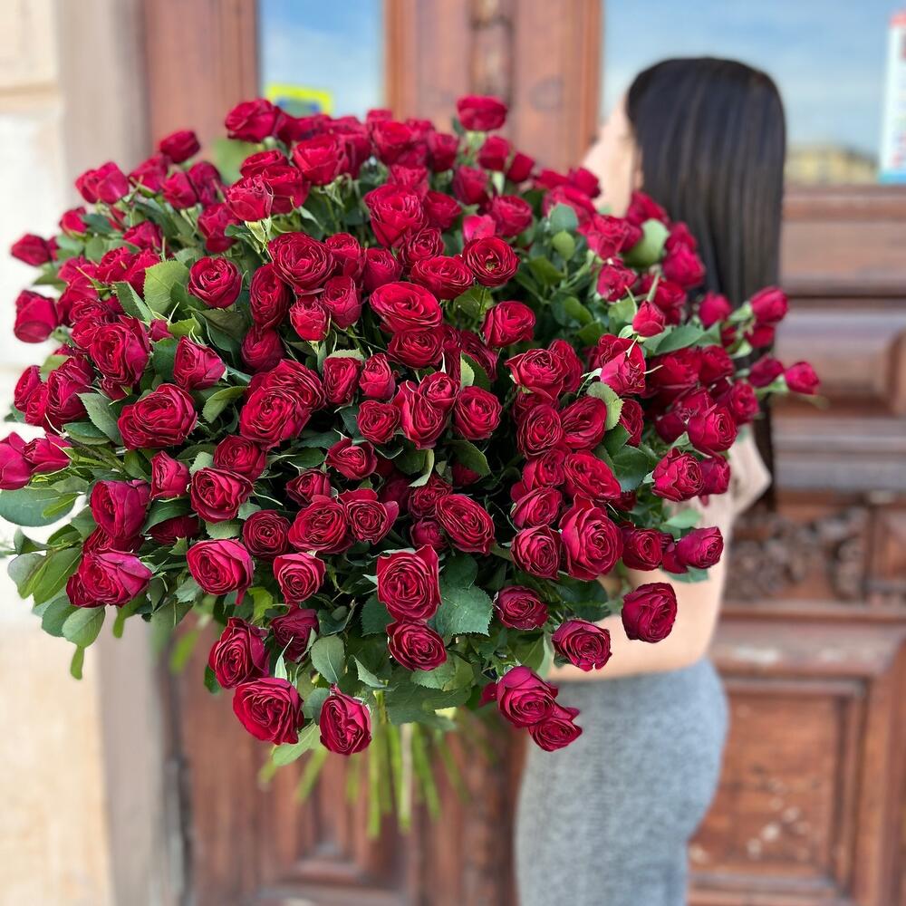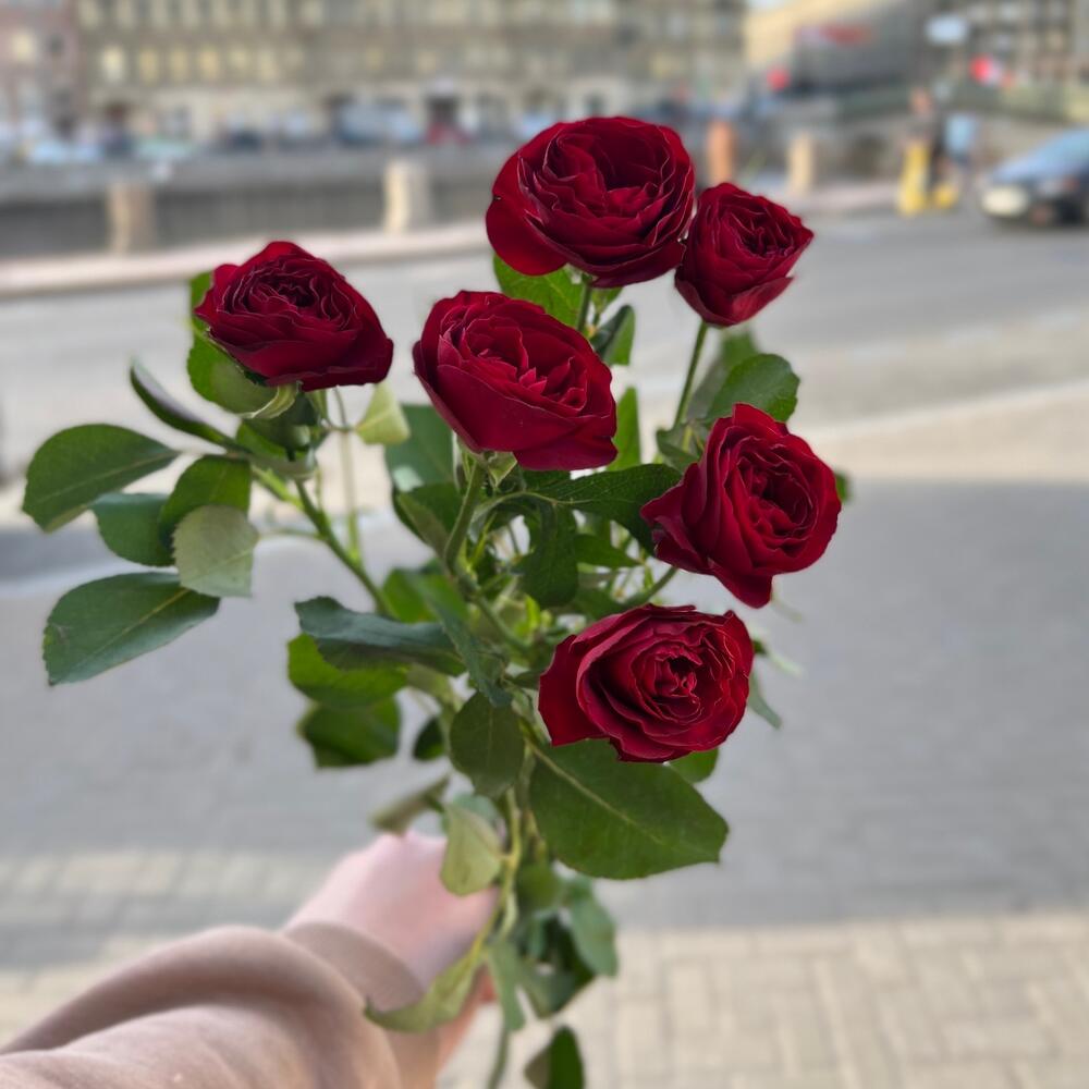 Лента атласная – 2 шт.Пленка матовая – 5 шт.роза кустовая ред трендсеттер – 5 шт.