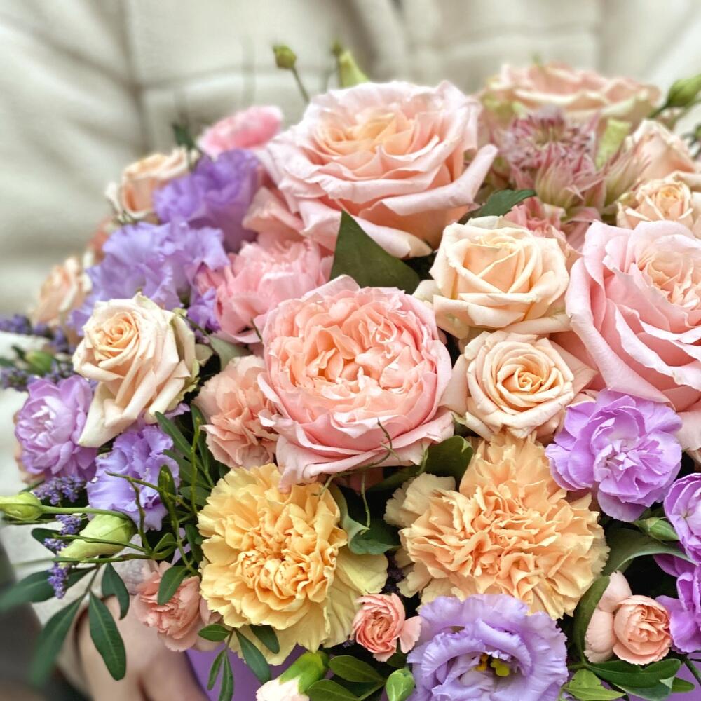 Гвоздики, Кустовые розы, Лизиантусы, Пионовидные розы, Розы