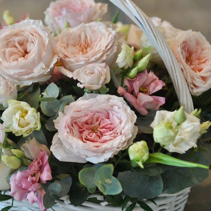розы пионовидные – 15 шт.Эвкалипт Baby Blue – 3 шт.